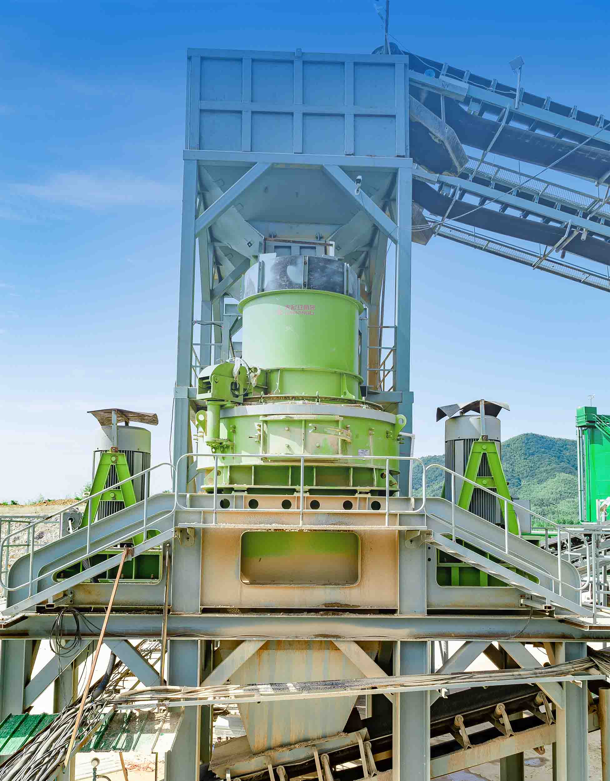 此條生產(chǎn)線以大鄂破機(jī)、單缸液壓圓錐破碎機(jī)、沖擊破制砂機(jī)、對輥機(jī)(高壓輥磨機(jī))等主機(jī)為核心,采用全自動中央控制系統(tǒng),動態(tài)調(diào)整成品砂石比例,甚至可實現(xiàn)全制砂生產(chǎn)